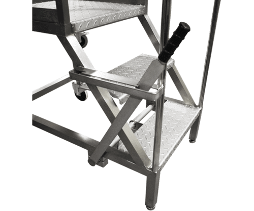To support safe positioning during use, the steps are fitted with two rear fixed castors and a front retractable swivel castor, operated via a lever mechanism and secured using a locking handle.
