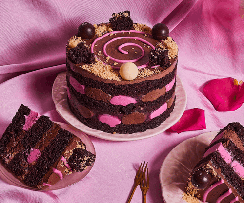 ● Eid Chocolate & Raspberry Falooda Cake (£47.99) Layered fluffy chocolate sponge infused with a subtle rose, filled with silky chocolate buttercream, fragrant rose ganache, and nostalgic raspberry falooda jam made with basil seeds and a delicate biscuit crumble.
