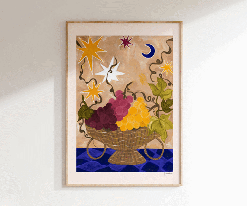 Frankie Penwill says, “I loved collaborating with the team at Renais and was inspired by the grape harvest in Chablis to create the label, sleeve and print adorned with the harvest moon, stars, vines and grapes. Alex and Emma have chosen only the finest botanicals for their gin and that really resonated with me and my work. I’m looking forward to seeing where Renais drinkers will put up their prints in the coming months.”
