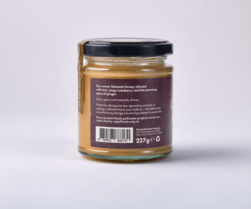 Blossom honey, the humble hero of Scottish Bee’s last revelatory launch, a truly decadent and intensely chocolate spread, once again takes centre stage, this time playing host to zingy cranberry and the warm, spicy tingle of ginger.